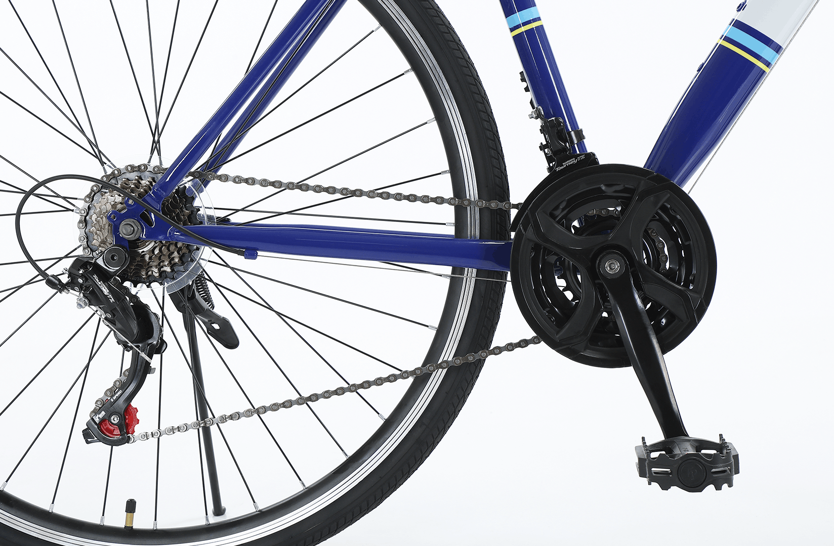 Die Shimano 21-Gang-Schaltung (3×7) ermöglicht eine flexible Anpassung an unterschiedliche Fahrbedingungen. Zuverlässige Aluminium-V-Bremsen sorgen für sicheres und kontrolliertes Bremsen.