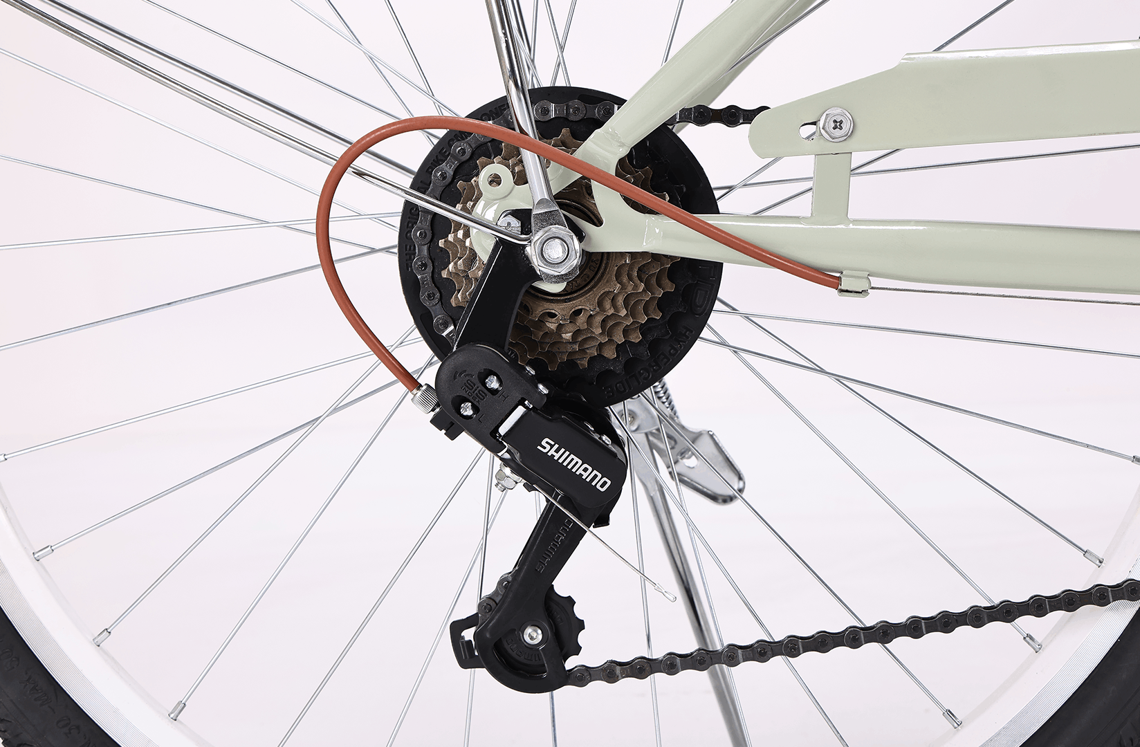 Die SHIMANO 7-Gang-Schaltung ermöglicht leichtes und präzises Schalten, während V-Brakes vorne und hinten für sichere Bremsleistung sorgen. Dank der umfangreichen Ausstattung ist dieses Fahrrad sofort einsatzbereit.